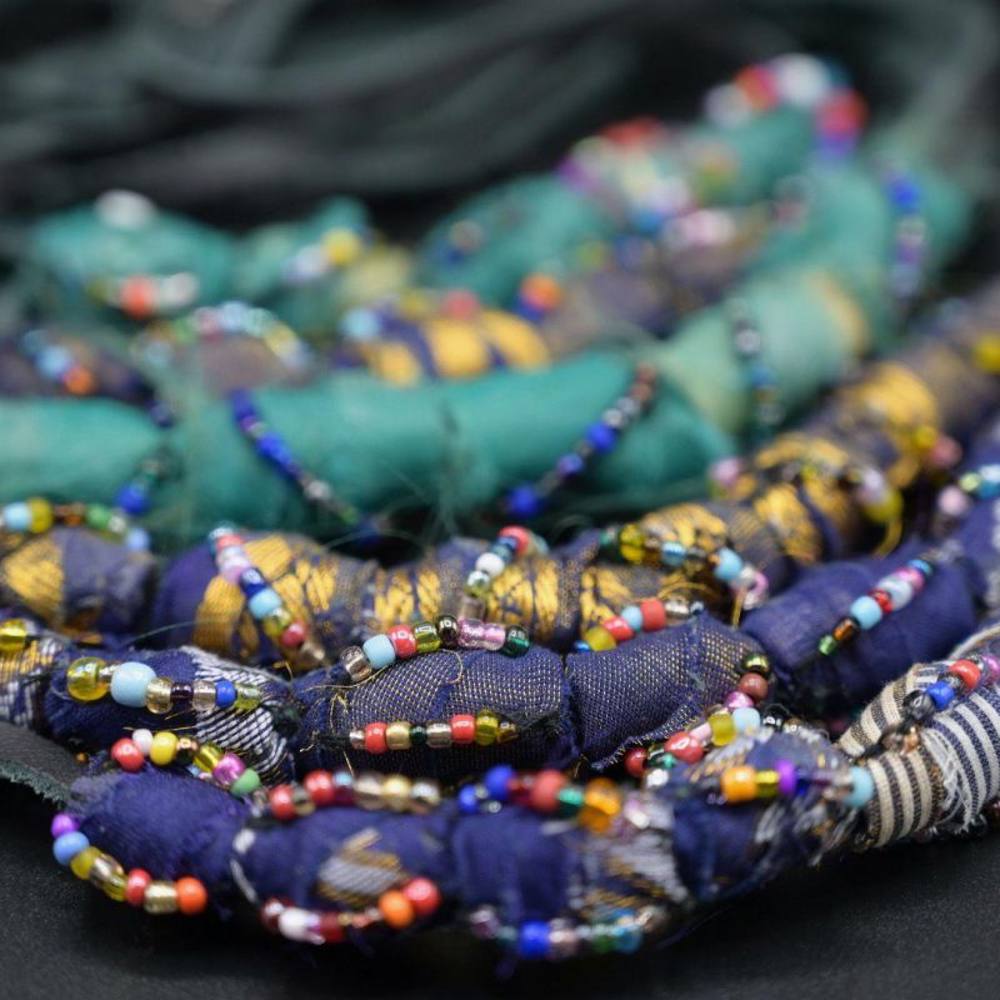 Products include Sri-Lankan inspired jewelled bangles made from Pringles tubs and spare saree fabric which are decorated with glass beads and appliqued to make the bangles elegant and soft. Scrap leather from the nearby Bridge of Weir factory is also used to make purses. The brand also offers an upcycling service in which customers can donate their unwanted jewellery.